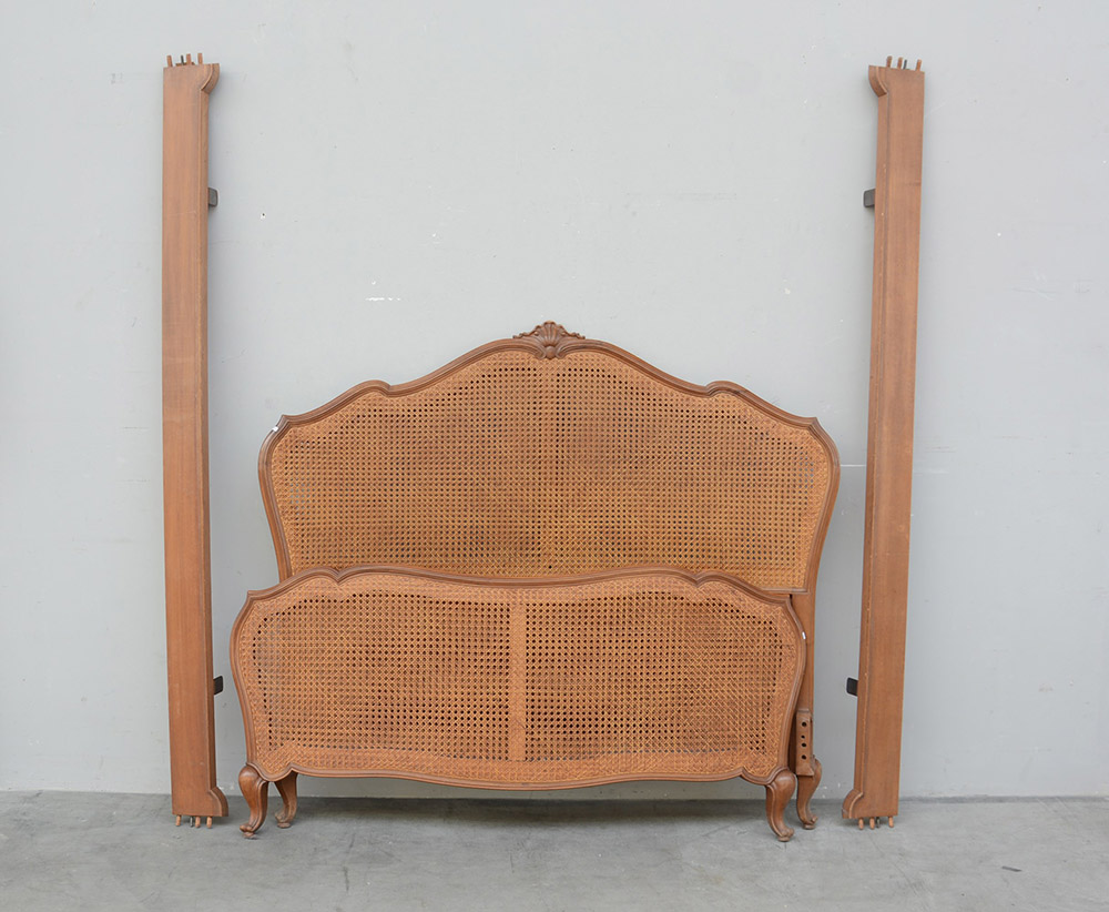 Letto ad una piazza e mezza in noce con testata e pediera sagomate rivestite in paglia di Vienna (completo di sponde)