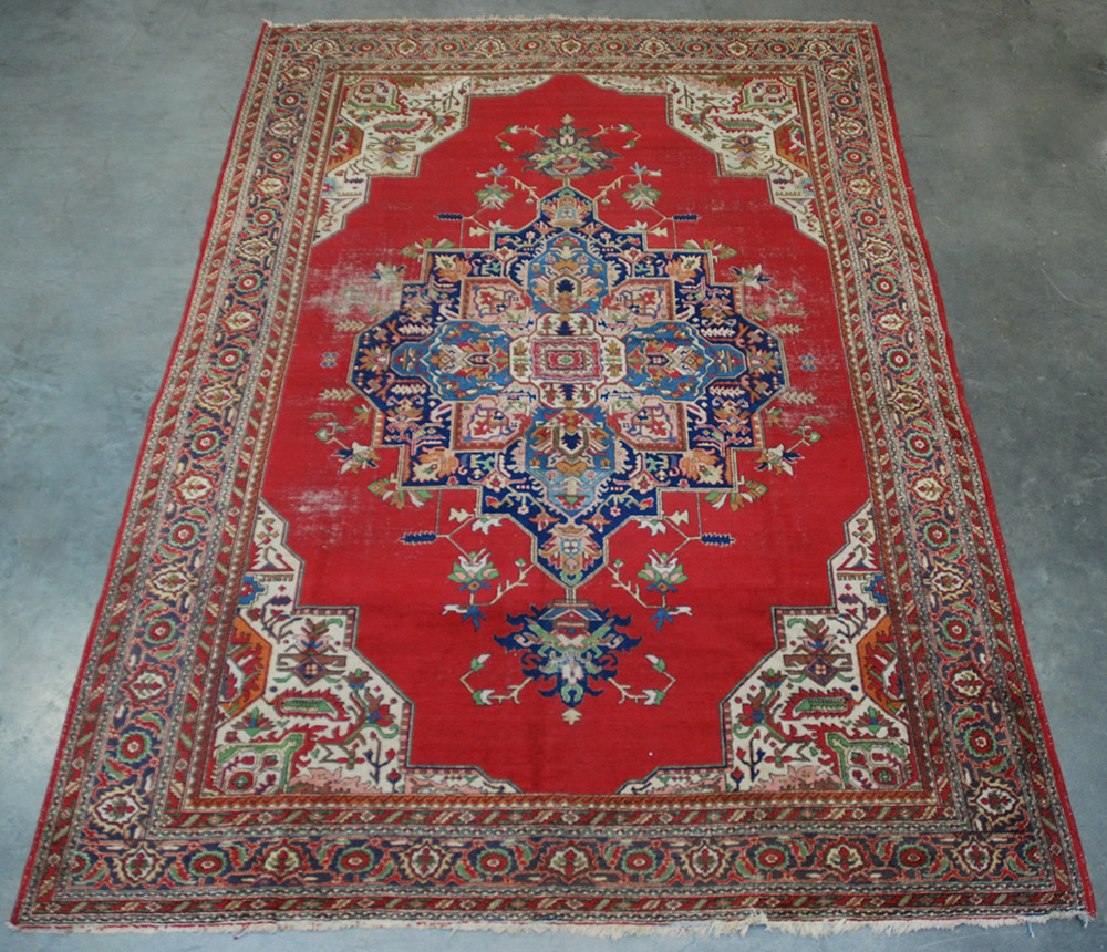 Tappeto orientale decorato a motivi floreali stilizzati e medaglione centrale nei toni del rosso, blu, verde e avorio (cm 393x275) (gravi difetti)