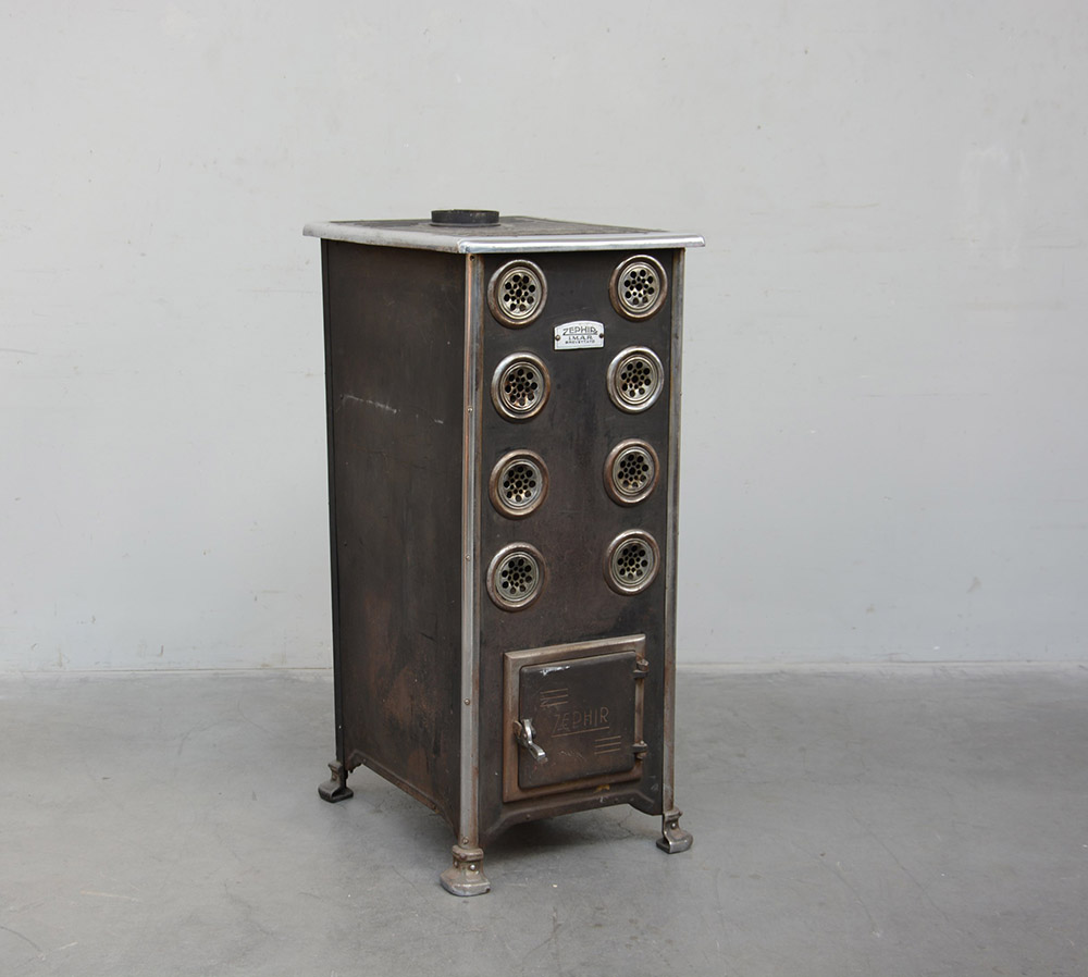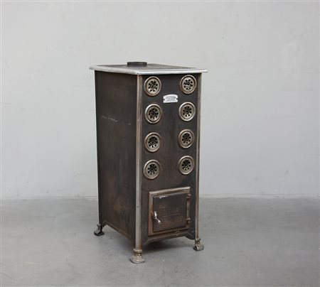 Stufa in metallo decorata con placchetta e iscritta Zephir Imar brevettato. Inizio sec. XX (difetti)