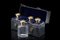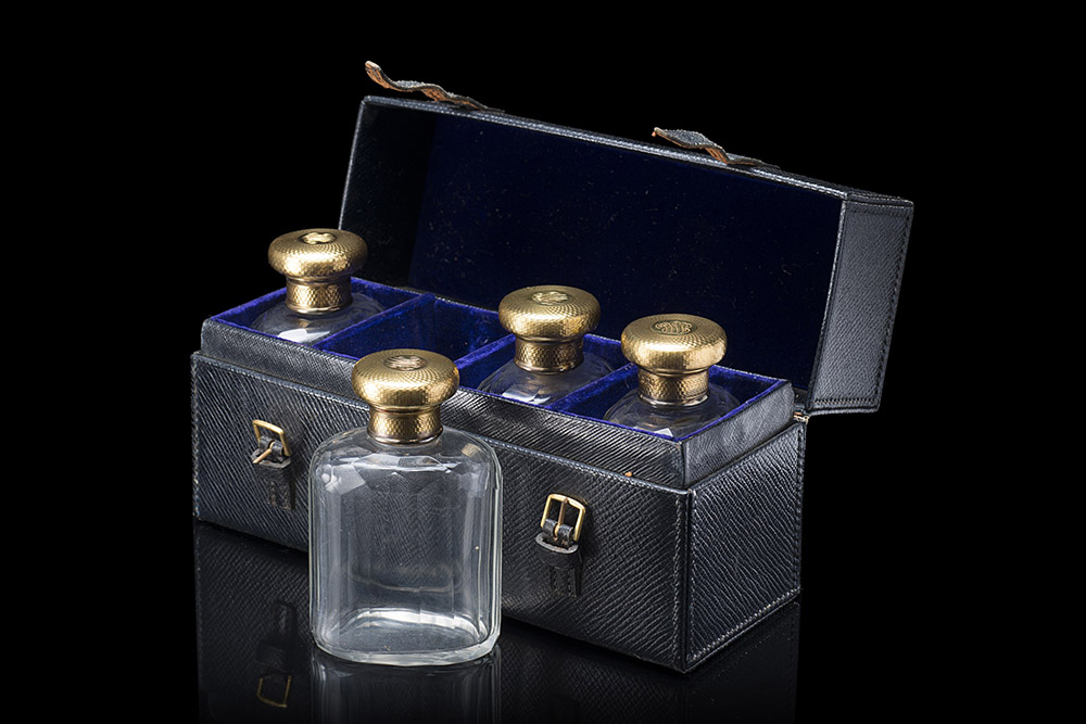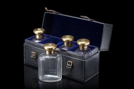 Servizio composto da quattro bottiglie portaprofumo in vetro sfaccettato e tappi in argento dorato lavorato a guillochè e inciso con monogramma. In custodia. Argentiere Asprey&Co. Londra, 1911 (h. cm 12)