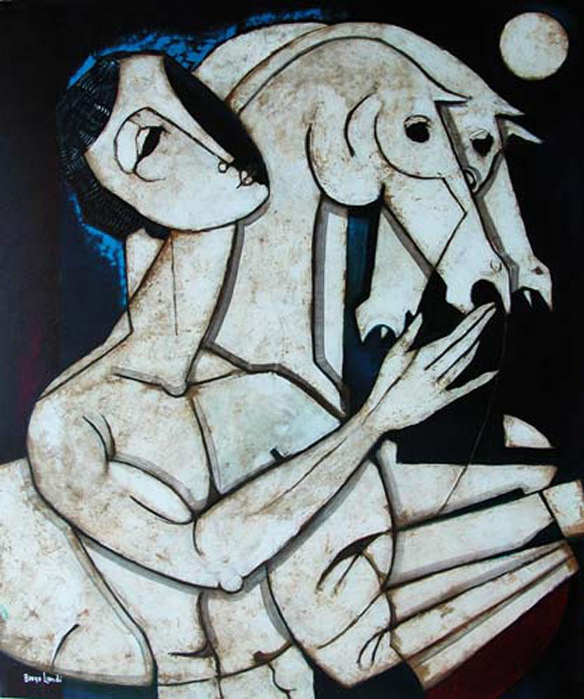 BRUNO LANDI Roma 23/03/1941 Il domatore di cavalli, 2003 olio su tela cm. 120x100, firma in basso a sinistra, titolo e firma al retro, dichiarazione d'autenticità dell'artista e archivio numero 0772/2003 a cura della Meeting Art (VC) su foto, pubblicato sul "Catalogo Generale delle Opere di Bruno Landi", primo volume, testi di Paolo Levi, Editoriale Giorgio Mondadori, pagina 76 con tavola a colori.