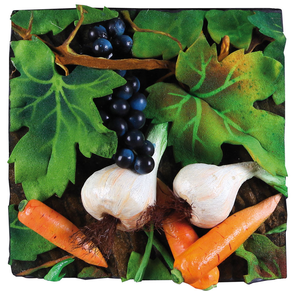 PIERO GILARDI Torino 03/08/1942 Cipolle, carote e uva, 2003 poliuretano espanso cm. 30x30, firma, titolo e anno al retro, dichiarazione d'autenticità dell'artista su foto, entro teca in plexiglass.