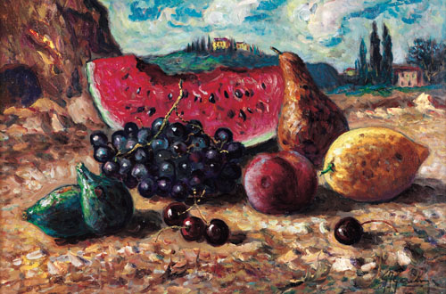 GIOVANFRANCESCO GONZAGA Milano 12/06/1921 - Milano 02/10/2007 Frutti in un paesaggio lombardo, 1995 olio su tela cm. 40x60, firma in basso a destra, titolo, firma, anno, timbro e archivio al retro, dichiarazione d'autenticità dell'artista e archivio ANM2119 a cura della Galleria Il Salotto (MI) su foto, opera pubblicata sul catalogo della "Mostra Antologica Giovan Francesco Gonzaga" tenutasi dal 23 maggio al 14 Giugno 2009 presso la Meeting Art (VC) in occasione dei 30 anni a pagina 38.