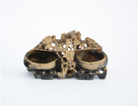Vaso a doppio scomparto in pietra saponaria (difetti e mancanze) Cina, sec. XX (l. 14 cm.)