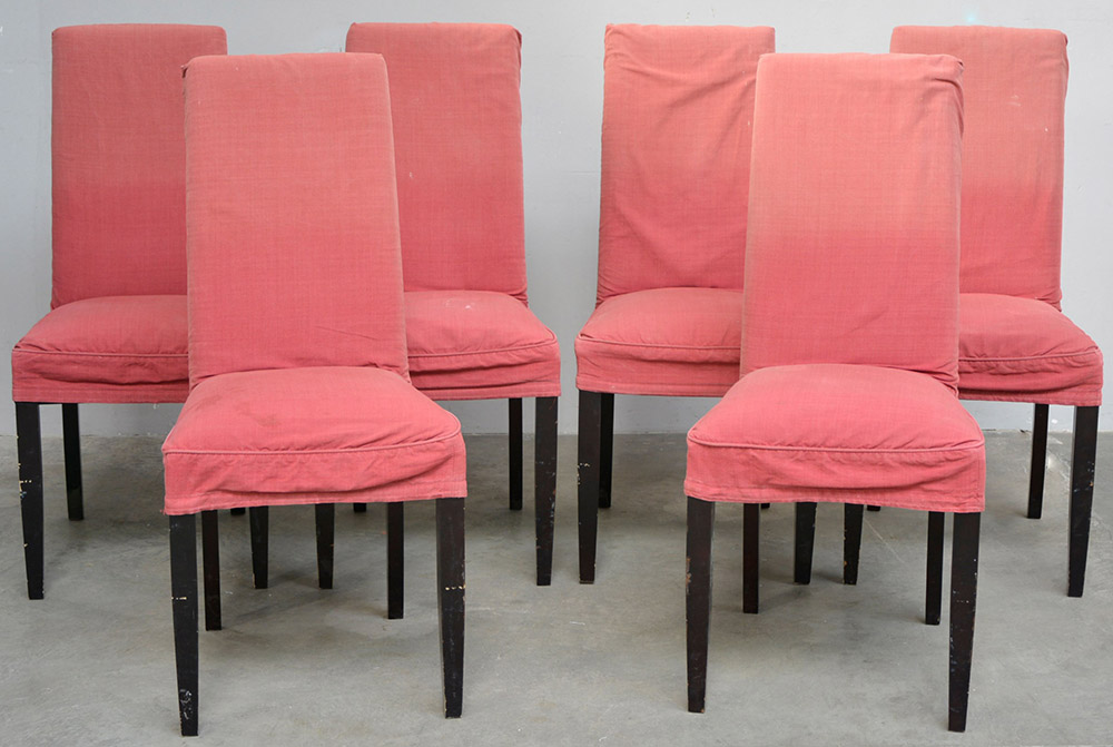 Gruppo di sei sedie imbottite con gambe squadrate rivestite in color rosa pastello (lievi difetti)