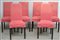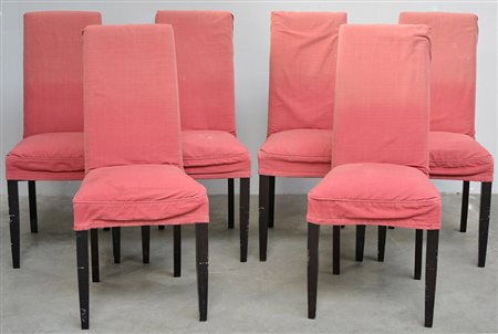 Gruppo di sei sedie imbottite con gambe squadrate rivestite in color rosa...