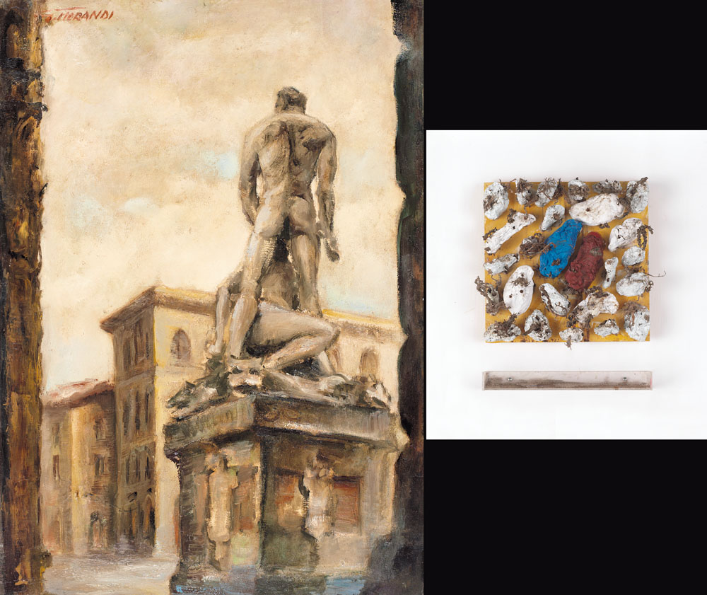 AUTORI VARI GIORGIO MORANDI Il monumento, 1972 olio su tela cm. 70x50, firma in alto a sinistra, firma, anno ed etichetta dell'artista al retro, reca dicitura di pugno dell'artista "Questo quadro ha vinto il primo premio extempore Via Vacchereccia, Coppa del Turista, messa in palio dal Presidente del Consiglio dell'Ente Regionale Toscano" al retro. BIAGIO PANCINO Frame Serial Trip, 1998/99 tecnica mista e applicazioni su tavola cm. 45x40, firma, titolo e anno al retro, entro teca in plexiglass.
