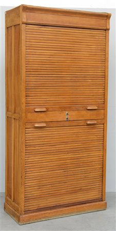 Mobile da ufficio in legno massello a due ante a saracinesca, montanti sagomati. Italia, anni 40 (cm 92x190x44)(difetti)