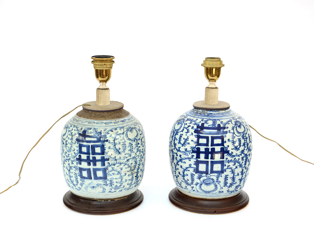 Due ginger jar in porcellana bianca e blu decorate con il motivo del "Doppio Xi", montate a lampada (difetti) Cina, sec. XX (h. tot. 86 cm.)