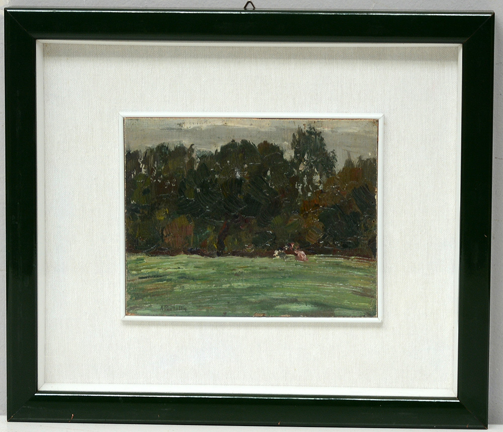 Ignoto, "Paesaggio", olio su tela incollata su pannello (cm 14,5x18,5) firmato Pratella in basso a sinistra, in cornice (difetti)