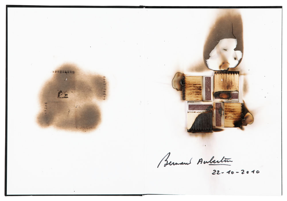 BERNARD AUBERTIN Fontenay aux Roses 1934 Dessin de feu, 2010 applicazioni di fiammiferi e combustioni su libro "Bernard Aubertin, il fuoco e il rosso", edizioni Galleria Rosenberg cm. 30,5x45, firma e anno in basso a destra, dichiarazione d'autenticità dell'artista su foto, entro teca in plexiglass