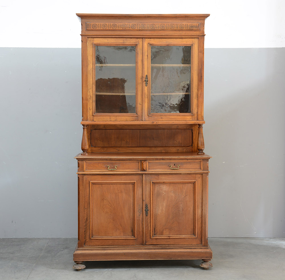 Credenza a due corpi in noce con parte superiore a due ante a vetri, parte inferiore a due cassetti e due sportelli riquadrati, montanti a colonna tornita. Piedi a cipolla. Fine sec. XIX (cm 123x228x55)