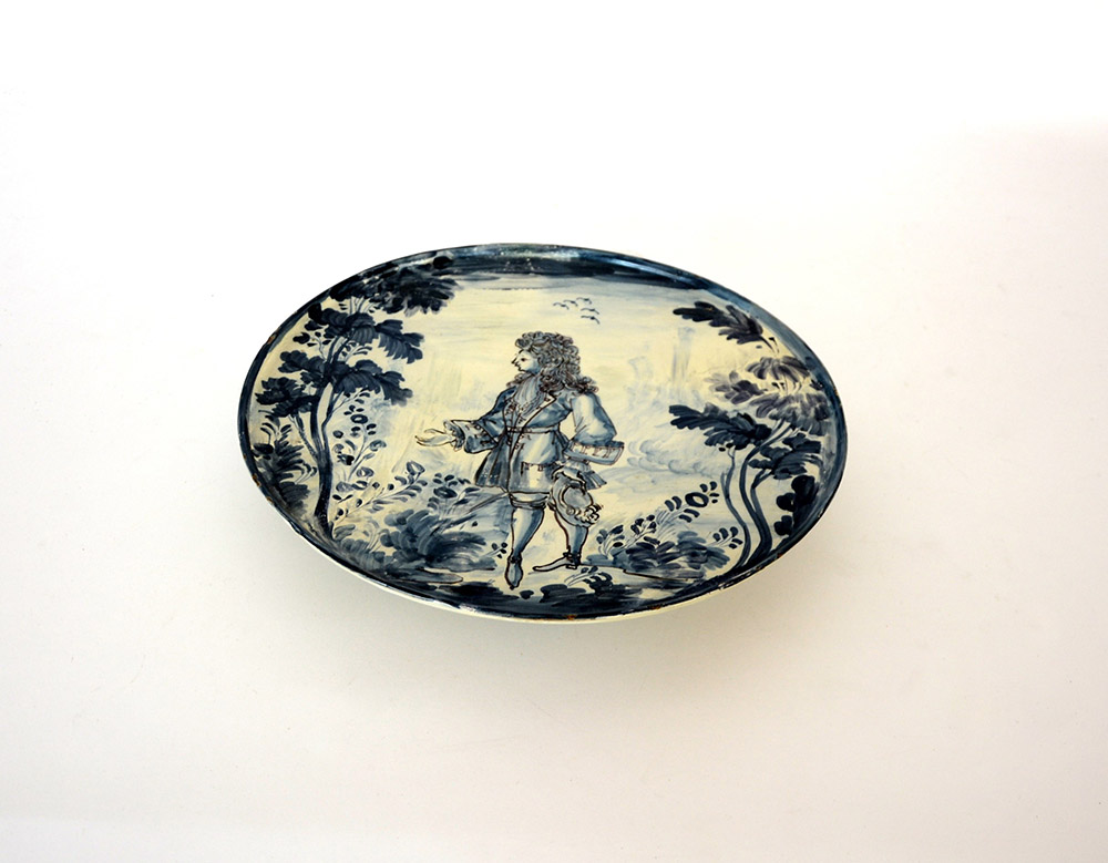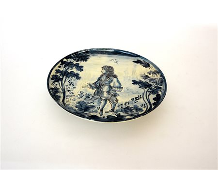 Manifattura di Anghirano, sec. XVIII. Alzatina in maiolica nei toni del blu decorata a figure in paesaggi (d cm 32xh cm 4) (restauri)