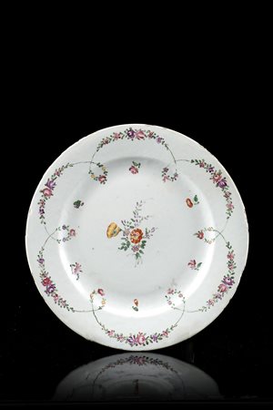 Piatto tondo a bordo liscio in porcellana con decoro policromo a ghirlande e fiori. Sec. XVIII/XIX (d. cm 23,7) (sbeccature e usure)