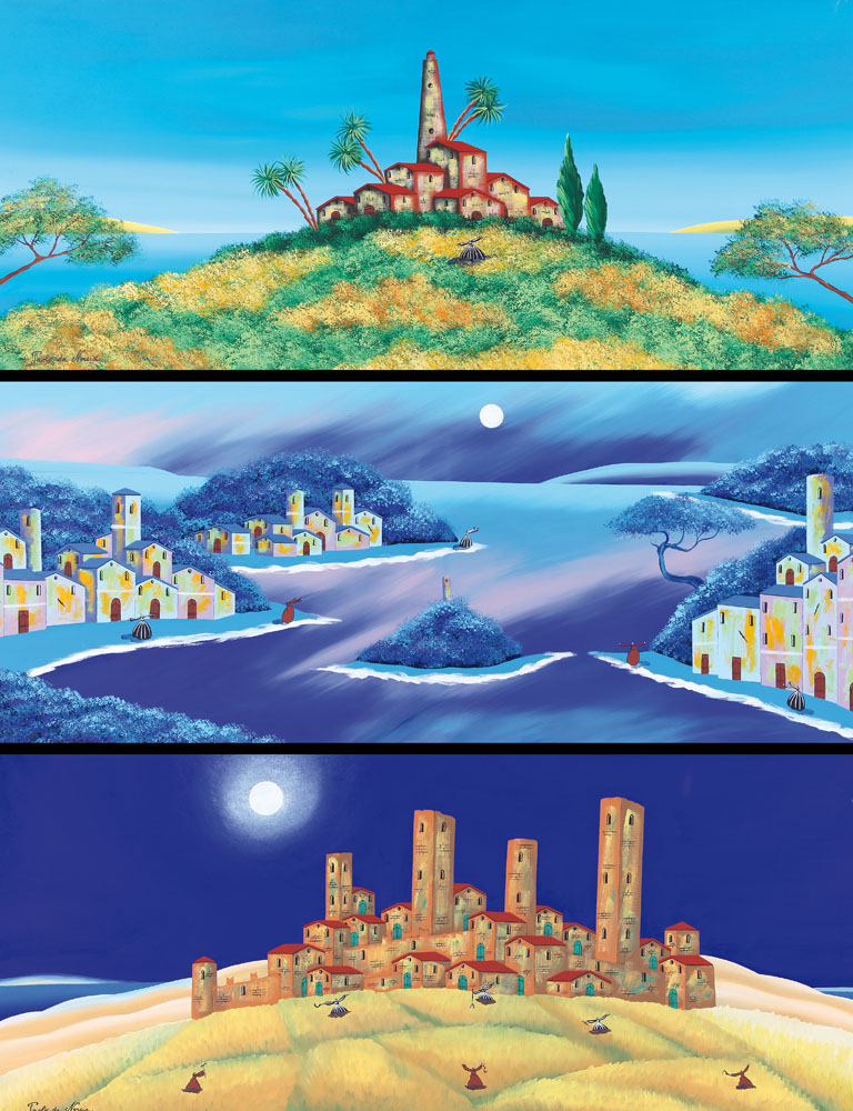 PAOLO DA NORCIA Caraglio (Cn) 05/11/1953 Notturno, 2001 olio su tela cm. 60x140, firma in basso a sinistra, firma, titolo, anno e timbri dell'artista al retro, dichiarazione d'autenticità dell'artista su foto. Portofino olio su tela cm. 60x140, firma in basso a sinistra, firma, titolo e timbri dell'artista al retro, dichiarazione d'autenticità dell'artista su foto. Paesaggio, 2002 olio su tela cm. 60x140, firma in basso a sinistra, firma e anno al retro, dichiarazione d'autenticità dell'artista su foto.