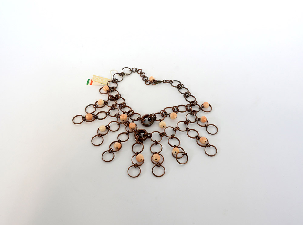 Collana composta da anelli concatenati in metallo brunito decorata con boules di conchiglia