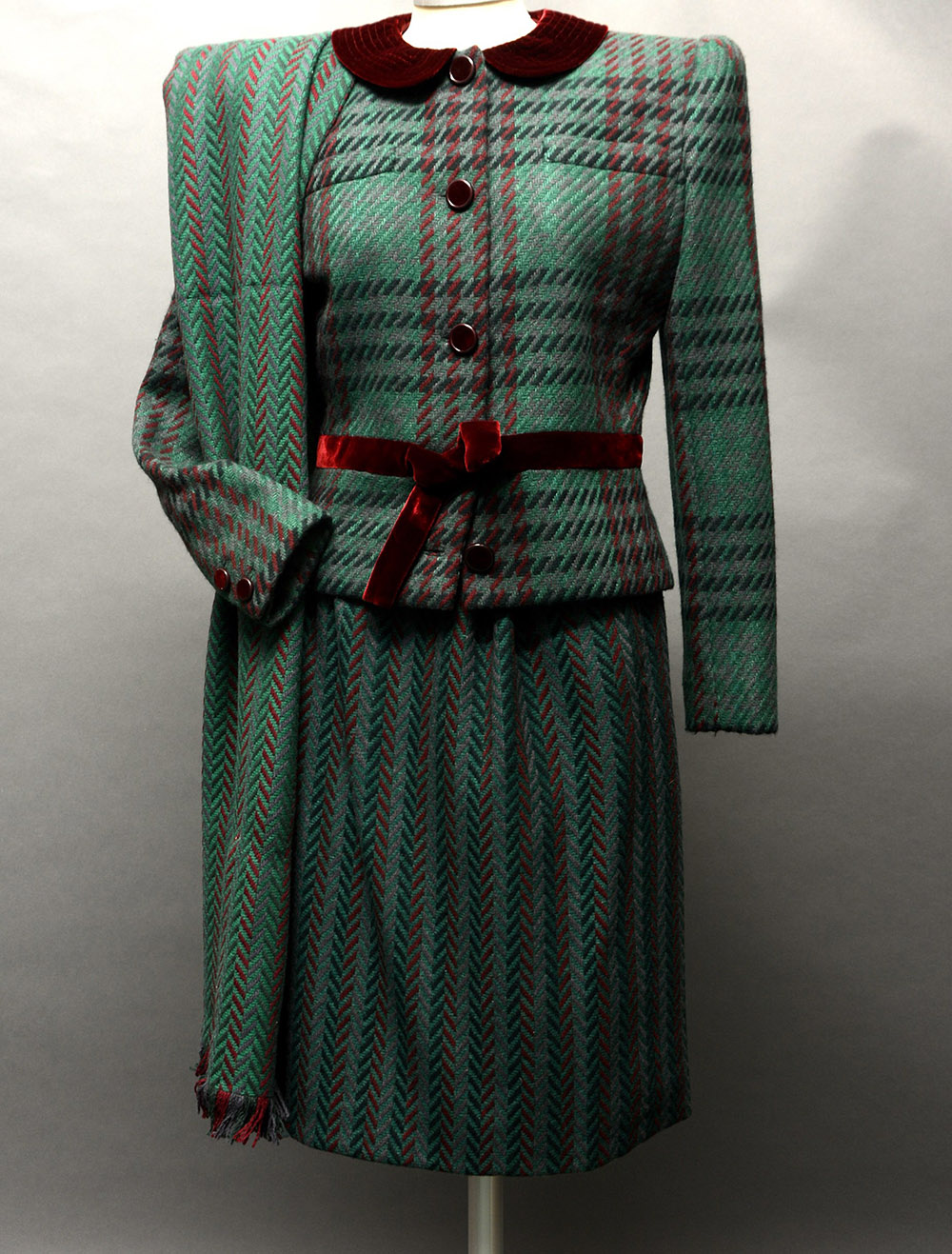 VALENTINO Tailleur in lana scozzese composto da giacca, gonna e sciarpa, dettagli in velluto (tg 38/40)