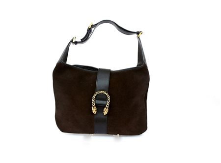 GUCCI, FIRENZE Borsa in camoscio e pelle color testa di moro con manico a spalla, fibbia con teste ferine in smalti e metallo color oro (cm 26) (difetti)