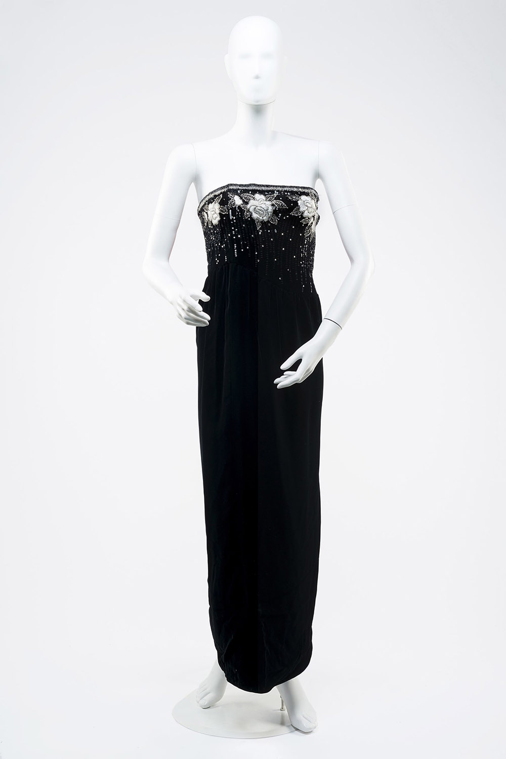 VALENTINO Vestito lungo senza maniche in velluto nero con ricamo di fiori in filo color argento sul busto (tg 40)(difetti)