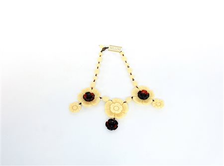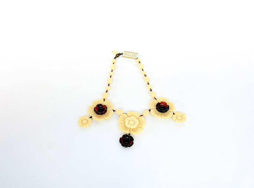 Collana con grandi fiori in galalite color avorio con inserti in similtartaruga