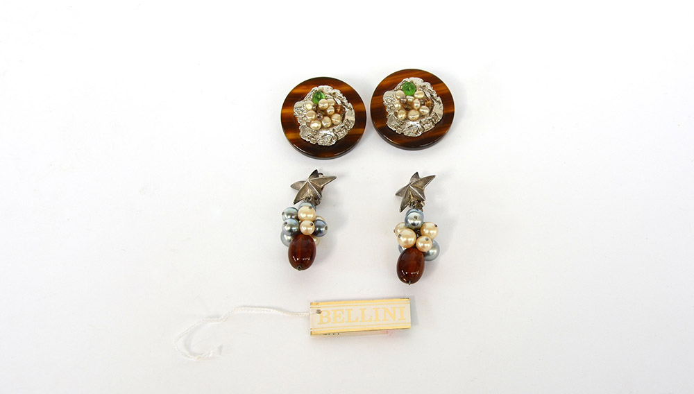Lotto composto da due paia di orecchini a clips, uno di forma circolare con perline di fiume e metallo color argento, l'altro pendente in perle fancy e resine colorate