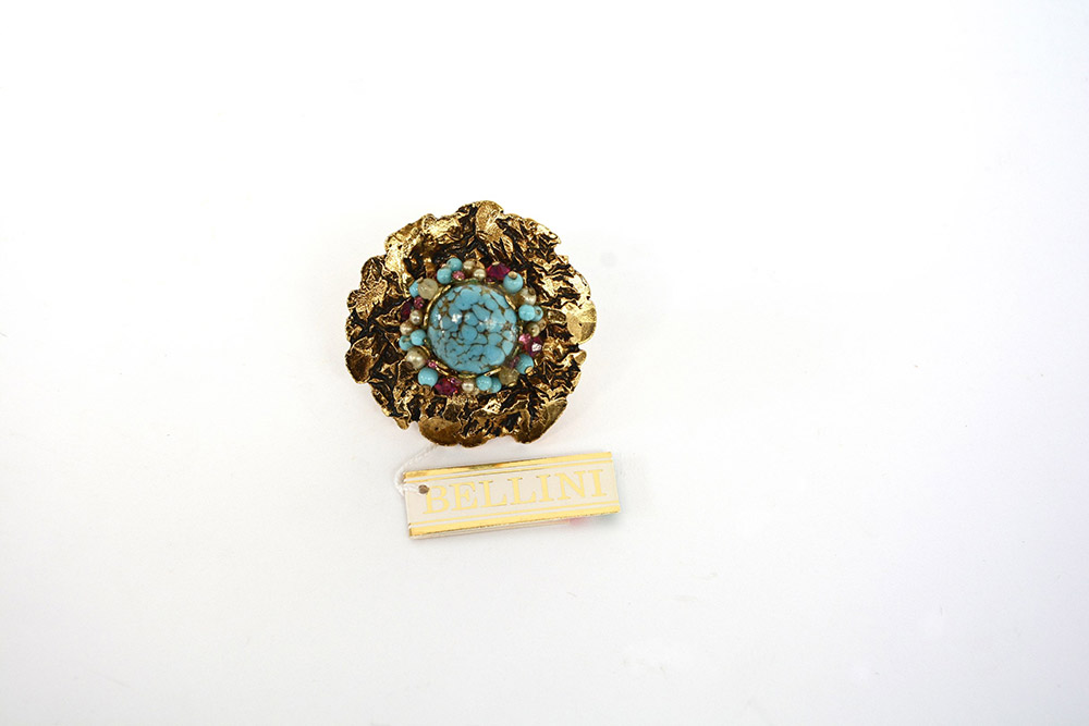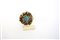 Grande anello a forma di fiore in metallo color oro centrato da perline fancy e pietre colorate color turchese e rosa