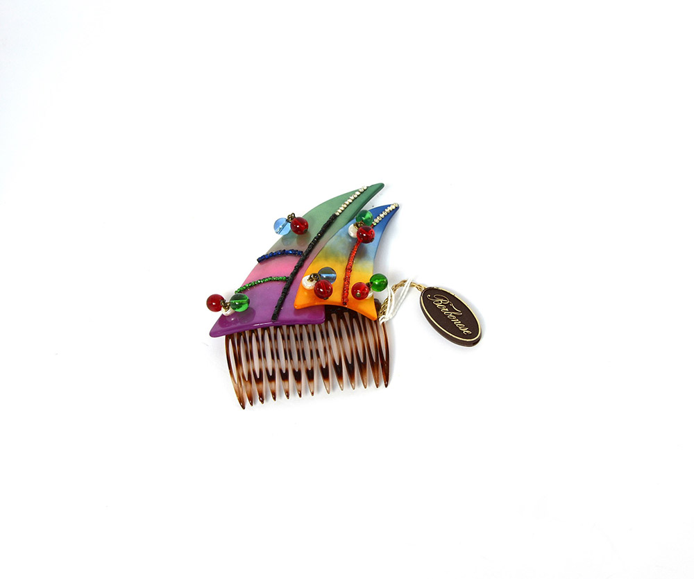 BORBONESE Pettinino da capelli in materiale plastico decorato da grandi vele spiegate in galalite multicolore e paste vitree