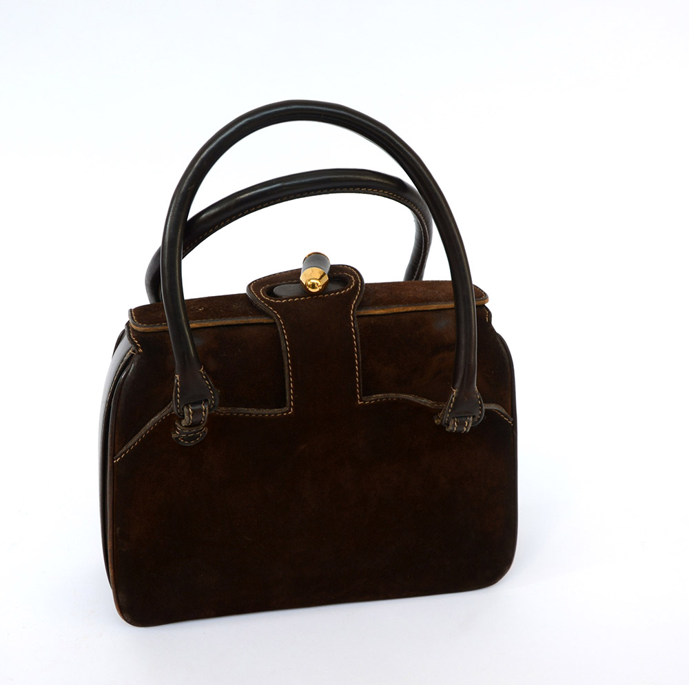 GUCCI FIRENZE Borsa in camoscio e cuoio a due manici color testa di moro (cm 29) (segni d'uso)