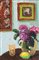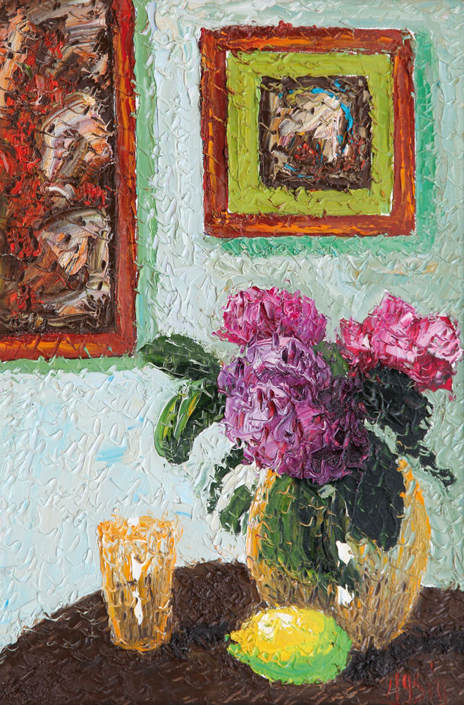 ROBERTO MASIA Iglesias (Ca) 20/02/1958 Interno con natura floreale olio su tela cm. 60x40, firma in basso a destra, titolo e firma al retro