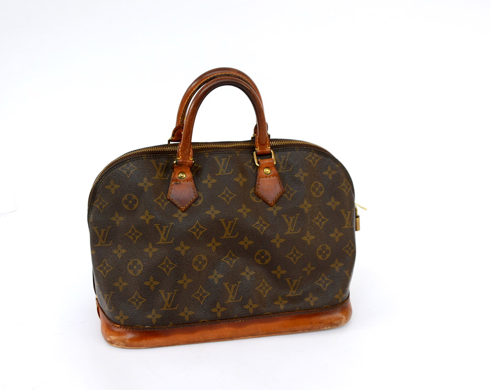 LOUIS VUITTON Borsa "Alma" a due manici in tela Monogram, finiture in vacchetta (cm 32)(difetti e segni d'uso)
