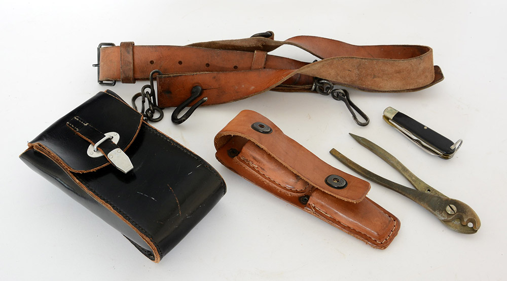Lotto composto da un cinturone militare in cuoio dei primi del '900, una giberna per caricatori in cuoio (II Guerra Mondiale) e attrezzi vari, quali una pinza e un coltello in astuccio di cuoio (II metà del XX secolo)
