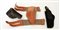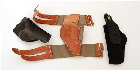 Lotto di una fondina in cuoio unita a cinghia da polpaccio per revolver; si aggiungono altre due fondine da revolver, di cui una in cuoio e una in tessuto