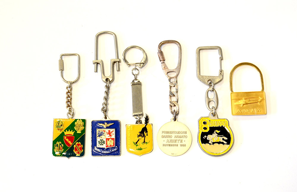 Lotto composto da sei portachiavi reggimentali in metallo smaltato. Italia, anni '80
