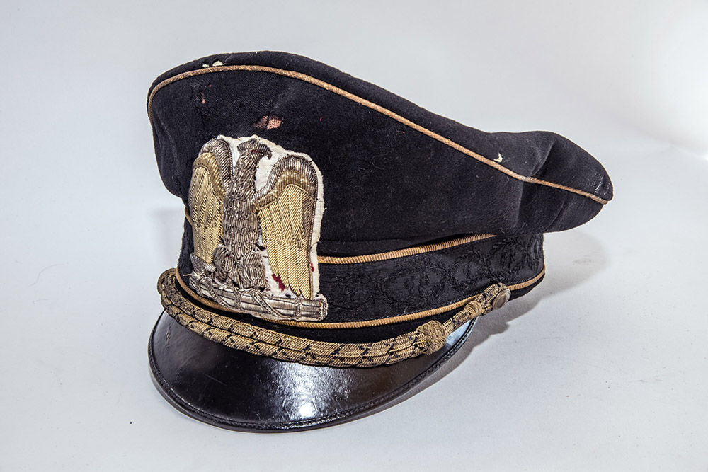 Berretto modello 1934 da gerarca del PNF., grado da Componente del Direttorio Federale. L'aquila del fregio era in origine sotto-pannata in rosso di cui oggi restano poche tracce. Oggetto raro, stato di conservazione medio. Italia