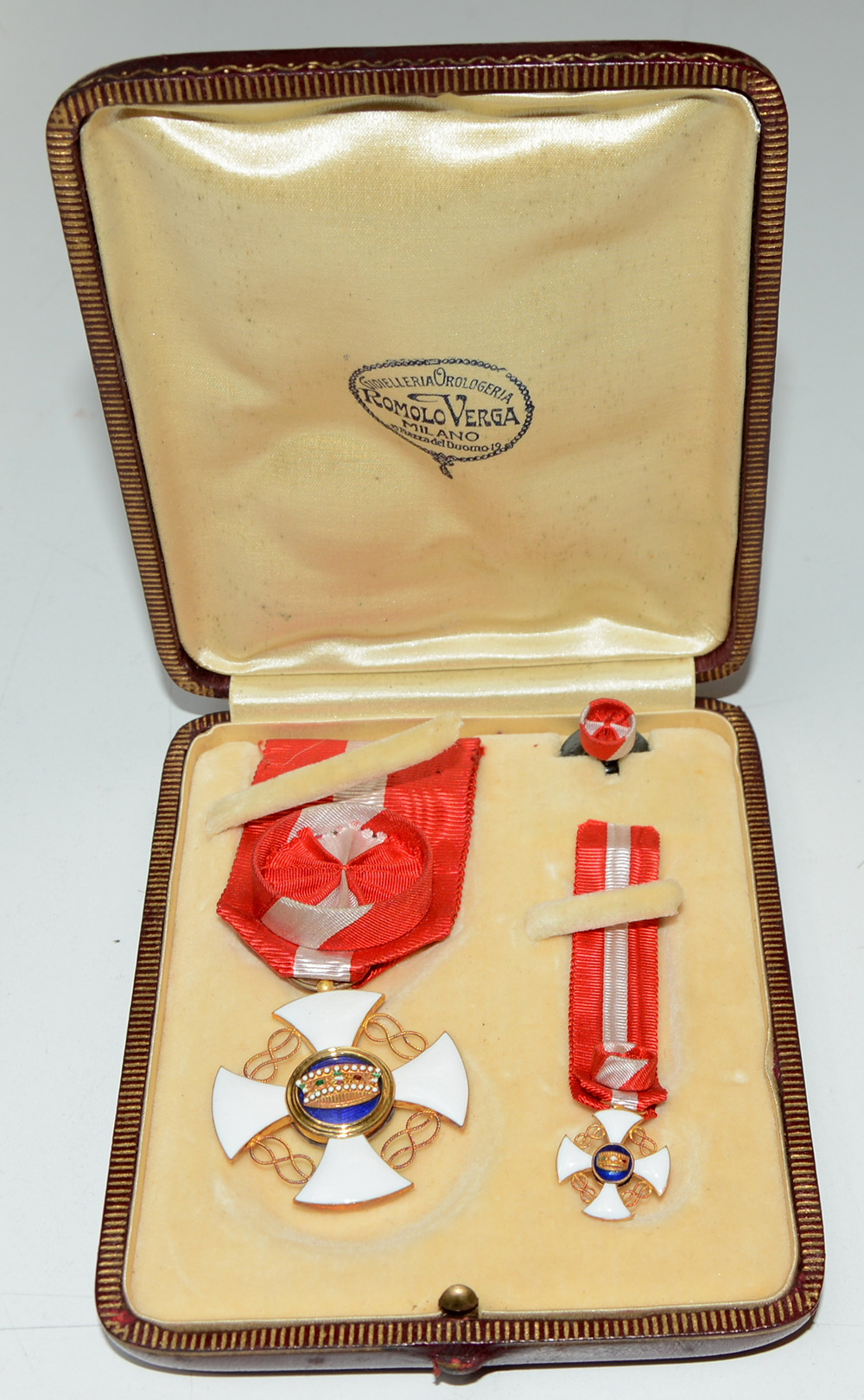 Insegna da cavaliere ufficiale dell’Ordine della Corona d’Italia, in argento, oro e smalti. Completa di sua mignonne in oro e di bottone. Prodotto di gioielleria della Ditta Romolo Verga di Milano. In custodia originale. Perfetto stato