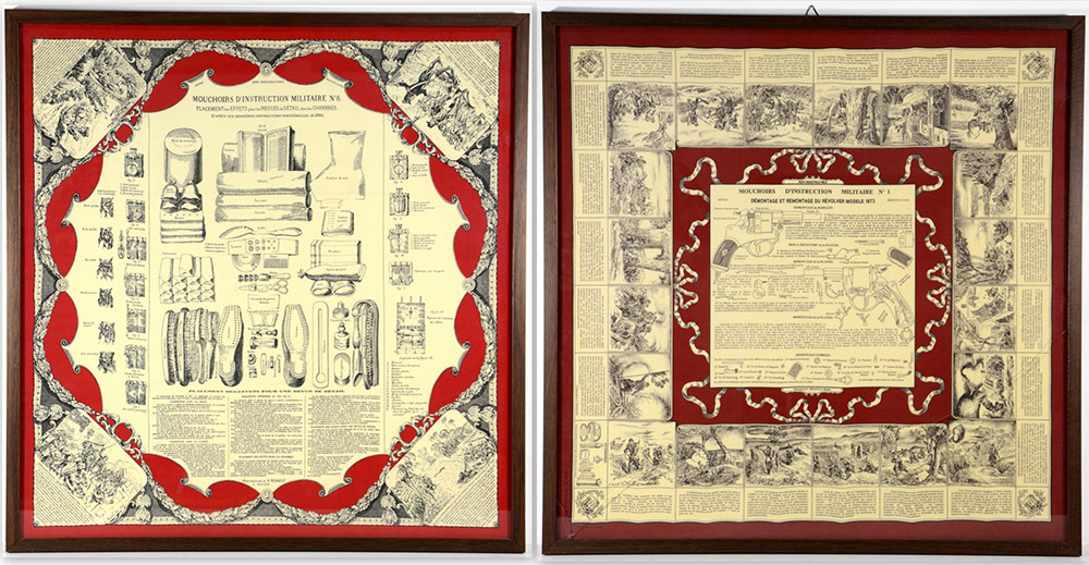 Coppia di foulards su seta (cm 75x75) decorati con soggetti militari. In cornice (difetti)