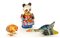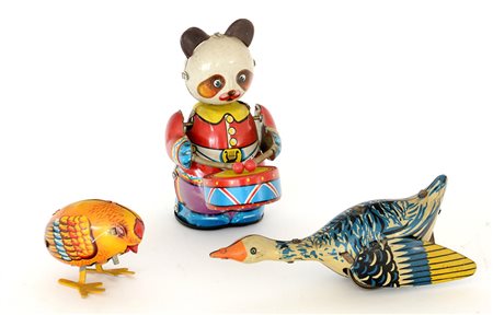 Lotto di tre giocattoli a molla di latta dipinta: un pulcino, un'anatra e un pupazzo che suona un tamburo. Cina, anni '60. Funzionanti (lievi difetti)