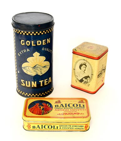 Lotto di tre scatole in latta stampata, due inglesi e una italiana. II metà del secolo XX
