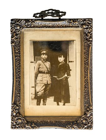 Fotografia d'epoca che ritrae un ufficiale dell'Esercito Imperiale Giapponese in compagnia di una signora. In cornice originale. Giappone 1941