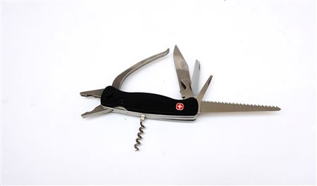 (Historica) Multiattrezzo in custodia di cuoio, marca Victorinox (Svizzera).