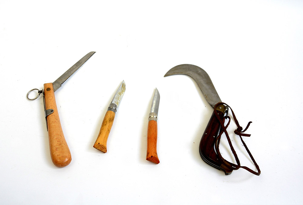 Lotto composto da una roncola pieghevole, una sega pieghevole e due coltelli Opinel