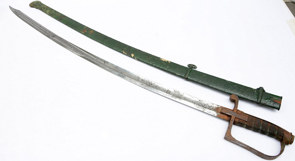 Sciabola da ufficiale di fanteria, modello 1855 Regio Esercito di Sardegna, completa di fodero. Bella lama con incisioni di trionfi d'armi e aquila sabauda (difetti)
