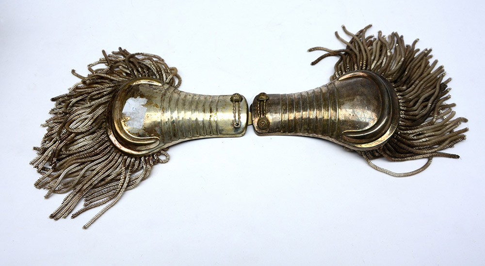 Coppia di spalline da sottotenente di fanteria in metallo argentato. Regno d'Italia, Regno Esercito, secondo quarto sec. XIX (difetti e mancanze)