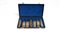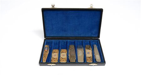 (Historica) Astuccio rigido contenente sette coltellini multipli da tasca, alcuni con dorature e smalti, due dei quali con emblema del Regno di Svezia ed i restanti con embema dell'Inghilterra.
