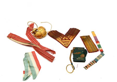 Lotto di bottoni, gradi da ufficiali superiori e decalogo del legionario unito ad alcune medaglie commemorative. PNF 1930