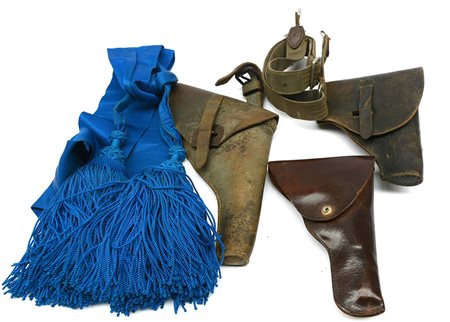 Lotto composto da tre fondine in cuoio per pistola del Regio Esercito unite ad un cinturino e una sciarpa d'ordinanza da ufficiale. Italia