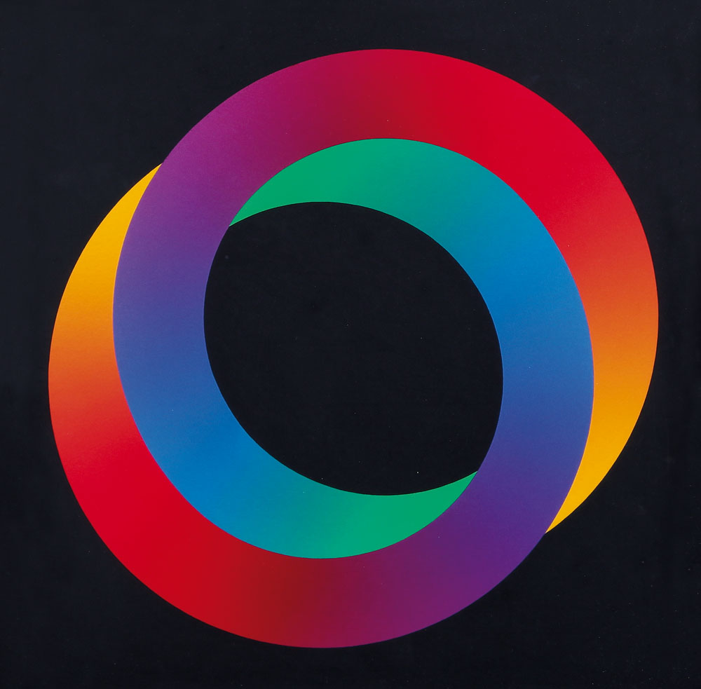 CELESTINO FACCHIN Farra d'Alpago 1940 Plastichromie aich-anello di Moebius, 1983 acrilici liquitex tecnica mista-aerografo su cartoncino applicato su masonite cm. 40x40, titolo, firma, anno e tecnica su etichetta dell'artista al retro.