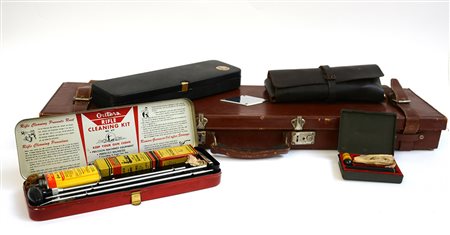 Lotto composto da una valigia porta fucili in cuoio e quattro set per pulizia delle armi