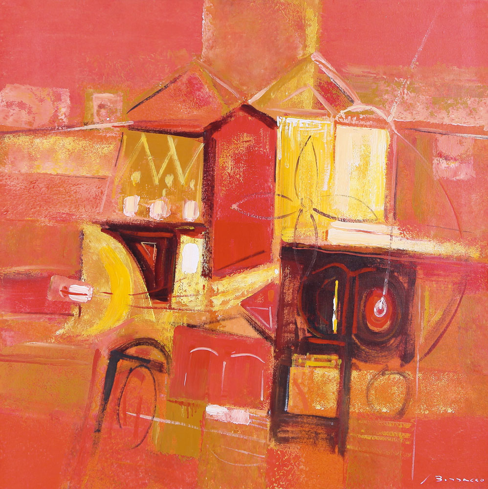 MARTINO BISSACCO Taglio di Po 21/04/1941 Paesaggio urbano olio su tela cm. 60x60, firma in basso a destra, titolo, firma e dedica ad personam al retro, opera senza cornice.