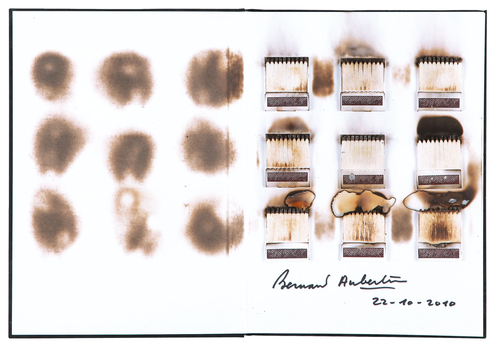 BERNARD AUBERTIN Fontenay aux Roses 1934 Dessin de feu, 2010 applicazioni di fiammiferi e combustioni su libro "Bernard Aubertin, il fuoco e il rosso", edizioni Galleria Rosenberg cm. 30,5x45, firma e anno in basso a destra, dichiarazione d'autenticità dell'artista su foto, entro teca in plexiglass.
